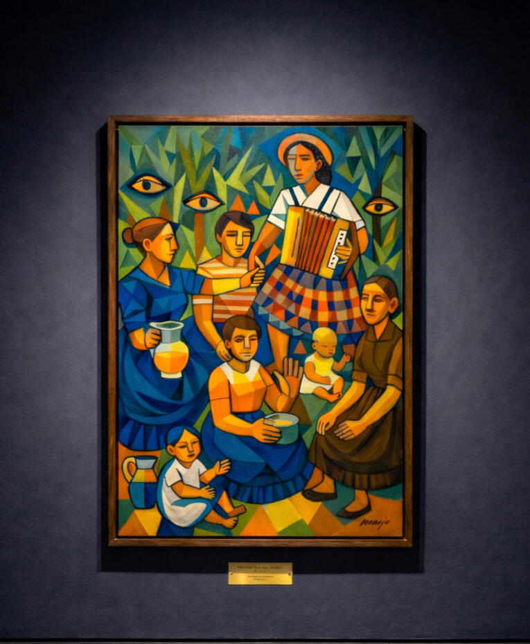 E ali estão também, no início da vida, a minha madrinha Emília e o meu tio Samuel. As matriarcas e o futuro da família, unidos na mesma imagem.O som da festa, a essência da terra do Minho, as saias e a alegria... nada disto se perdeu. Transformei esta memória ancestral em geometria e cor, para que a dança delas nunca termine.(Recomenda-se a visualização com som)